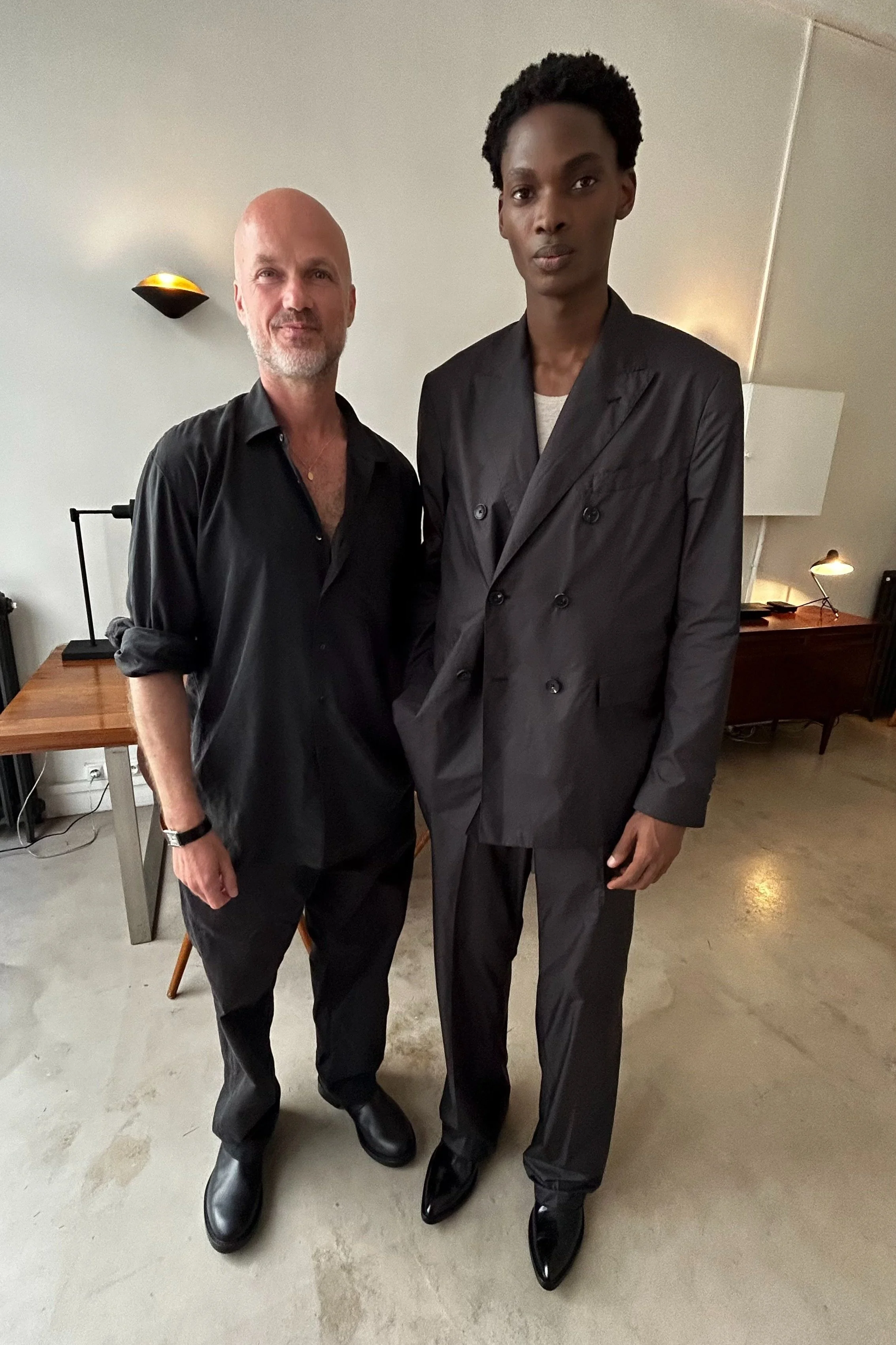 Aldo Maria Camillo et le mannequin portant avec élégance la veste de costume croisée, photographiés par Syrine Valetudie
